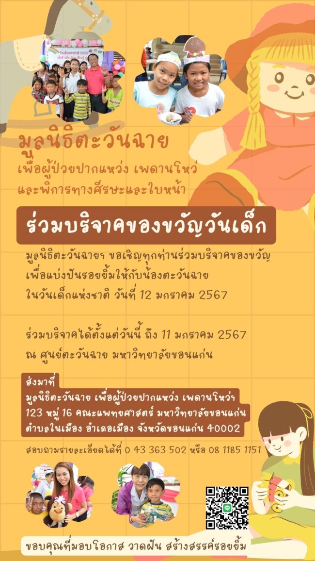 ครอบครัวสิริกานต์ คุ่ยยกสุย (อ.ดร.จอย) บริจาคตุ๊กตาสำหรับจัดกิจกรรมแบ่งปันรอยยิ้มให้กับน้องตะวันฉาย ในวันเด็กแห่งชาติ 2567 ที่จะจัดขึ้นในวันที่ 12 มกราคม 2567 ขอขอบคุณที่มอบโอกาส วาดฝัน สร้างสรรค์รอยยิ้ม
