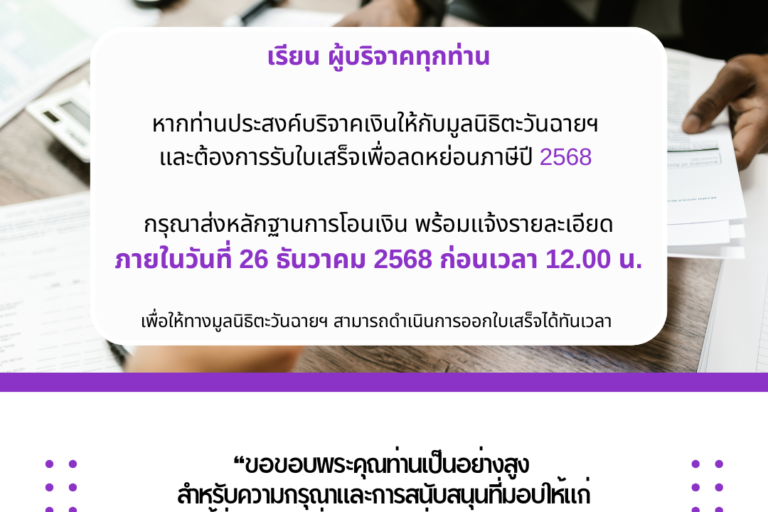 เมื่อวันพุธที่ 24 ธันวาคม 2568 คุณกษม จันทรประเสริฐ ได้บริจาคเงินจำนวน 40,000 บาท เพื่อสนับสนุนค่าใช้จ่ายในการเดินทาง ค่ารักษาพยาบาล และกิจกรรมของมูลนิธิตะวันฉายฯ ซึ่งให้ความช่วยเหลือผู้ป่วยปากแหว่งเพดานโหว่และความพิการแต่กำเนิดของศีรษะและใบหน้า มูลนิธิตะวันฉายฯ ขอขอบคุณเป็นอย่างสูงที่ท่านได้ร่วมเป็นส่วนหนึ่งในการมอบโอกาส…