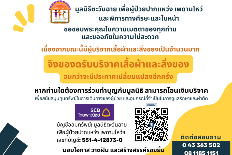 มูลนิธิตะวันฉาย เพื่อผู้ป่วยปากแหว่ง เพดานโหว่ และพิการทางศีรษะและใบหน้า ขอขอบพระคุณในความเมตตาของทุกท่านและขออภัยในความไม่สะดวก เนื่องจากขณะนี้มีผู้บริจาคเสื้อผ้าและสิ่งของเป็นจำนวนมาก จึงของดรับบริจาคเสื้อผ้าและสิ่งของ จนกว่าจะมีประกาศเปลี่ยนแปลงอีกครั้ง หากท่านใดต้องการร่วมทำบุญกับมูลนิธิ สามารถโอนเงินบริจาค เพื่อสนับสนุนทุนทรัพย์ในการเดินทางของผู้ป่วย และอุปกรณ์ที่จำเป็นในการดูแลรักษาและผ่าตัด ได้ที่ ธนาคารไทยพาณิชย์ สาขามหาวิทยาลัยขอนแก่น…