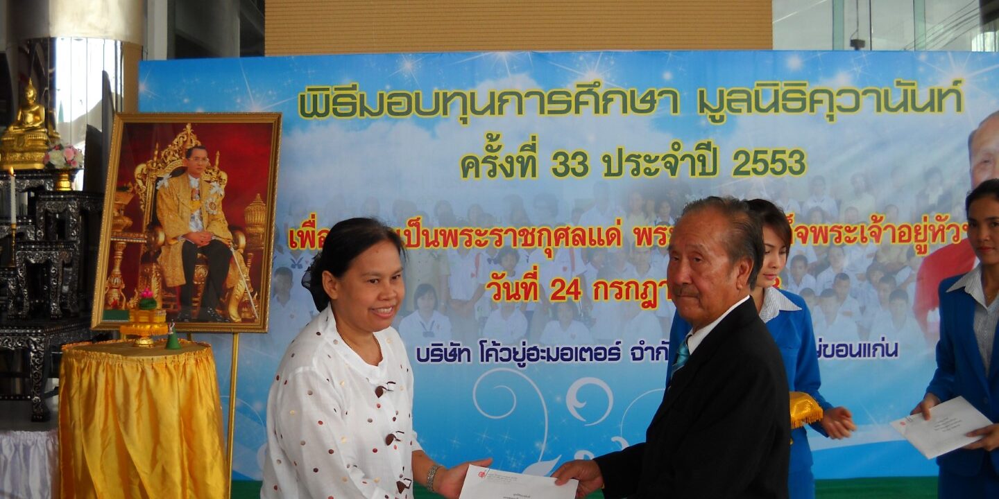 มูลนิธิคุวานันท์ โดย ดร.วิญญู คุวานันท์ ประธานกรรมการบริหารบริษัท โค้วยู่ฮะมอเตอร์ จำกัด และที่ปรึกษามูลนิธิตะวันฉายฯ มอบทุนการศึกษาให้แก่น้องตะวันฉายฯ จำนวน 20,000 บาท รับมอบโดย คุณสุธีรา ประดับวงษ์ กรรมการมูลนิธิและพยาบาลประสานงานฯ เมื่อวันที่ 24 กรกฎาคม 2553