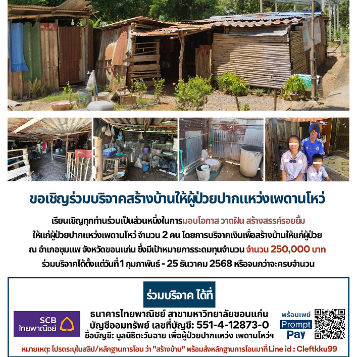 เรียนเชิญทุกท่านร่วมเป็นส่วนหนึ่งในการมอบโอกาส วาดฝัน สร้างสรรค์รอยยิ้มให้แก่ผู้ป่วยปากแหว่งเพดานโหว่ จำนวน 2 คน โดยการบริจาคเงินเพื่อสร้างบ้านให้แก่ผู้ป่วย ณ อำเภอชุมแพ จังหวัดขอนแก่น ซึ่งมีเป้าหมายการระดมทุนจำนวน จำนวน 250,000 บาท ร่วมบริจาคได้ตั้งแต่วันที่ 1 กุมภาพันธ์ – 25 ธันวาคม 2568 หรือจนกว่าจะครบจำนวน