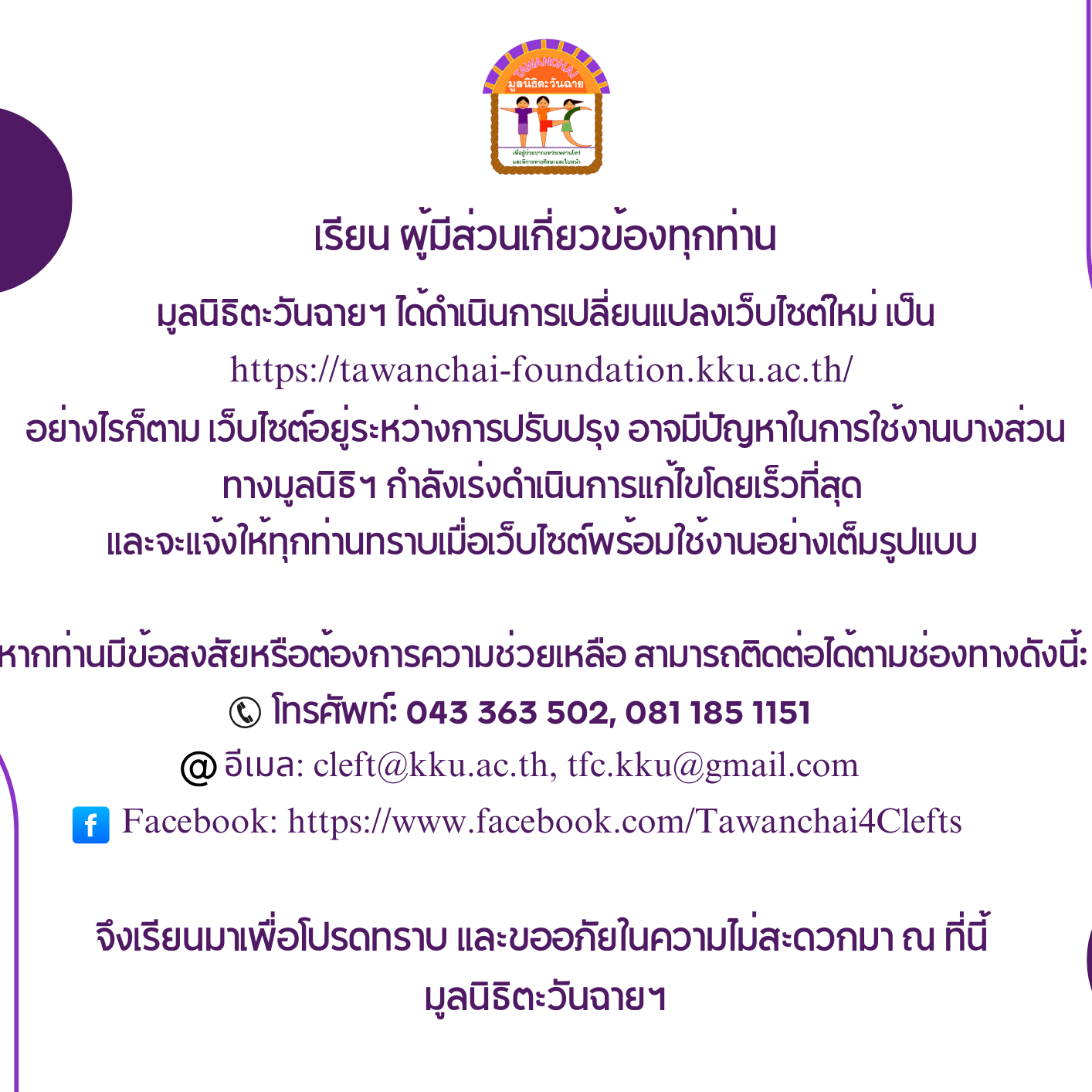 มูลนิธิตะวันฉายฯ ได้ดำเนินการเปลี่ยนแปลงเว็บไซต์ใหม่ เป็น https://tawanchai-foundation.kku.ac.th/ อย่างไรก็ตาม เว็บไซต์อยู่ระหว่างการปรับปรุง อาจมีปัญหาในการใช้งานบางส่วน ทางมูลนิธิฯ กำลังเร่งดำเนินการแก้ไขโดยเร็วที่สุด และจะแจ้งให้ทุกท่านทราบเมื่อเว็บไซต์พร้อมใช้งานอย่างเต็มรูปแบบ
