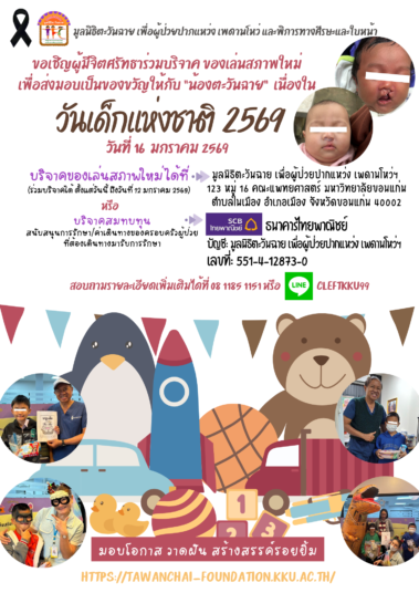 มูลนิธิตะวันฉาย เพื่อผู้ป่วยปากแหว่ง เพดานโหว่ และพิการทางศีรษะและใบหน้า ขอเชิญผู้มีจิตศรัทธาร่วมบริจาค ของเล่นสภาพใหม่ เพื่อส่งมอบเป็นของขวัญให้กับ “น้องตะวันฉาย” เนื่องในวันเด็กแห่งชาติ 2569 วันที่ 16 มกราคม 2569